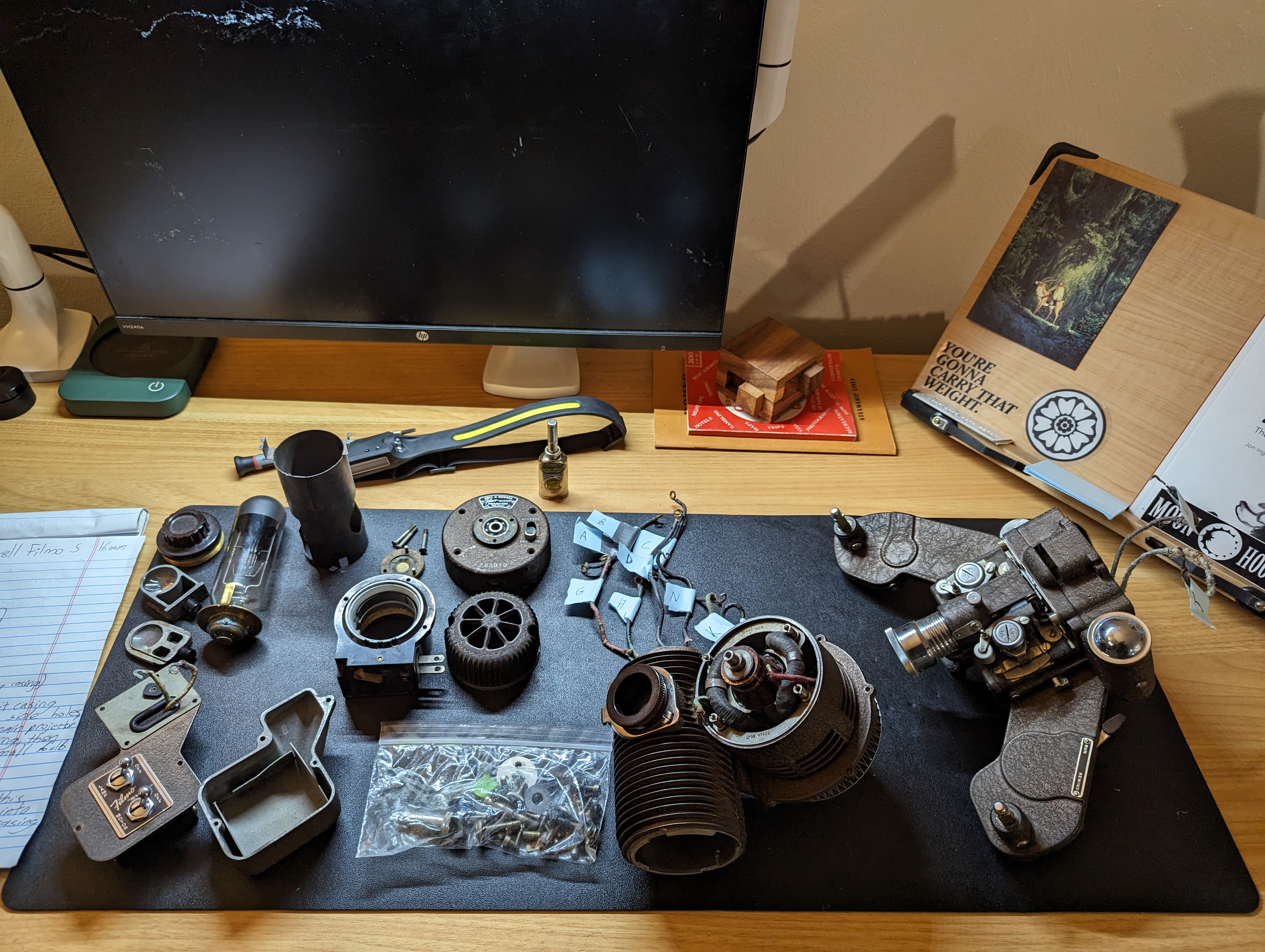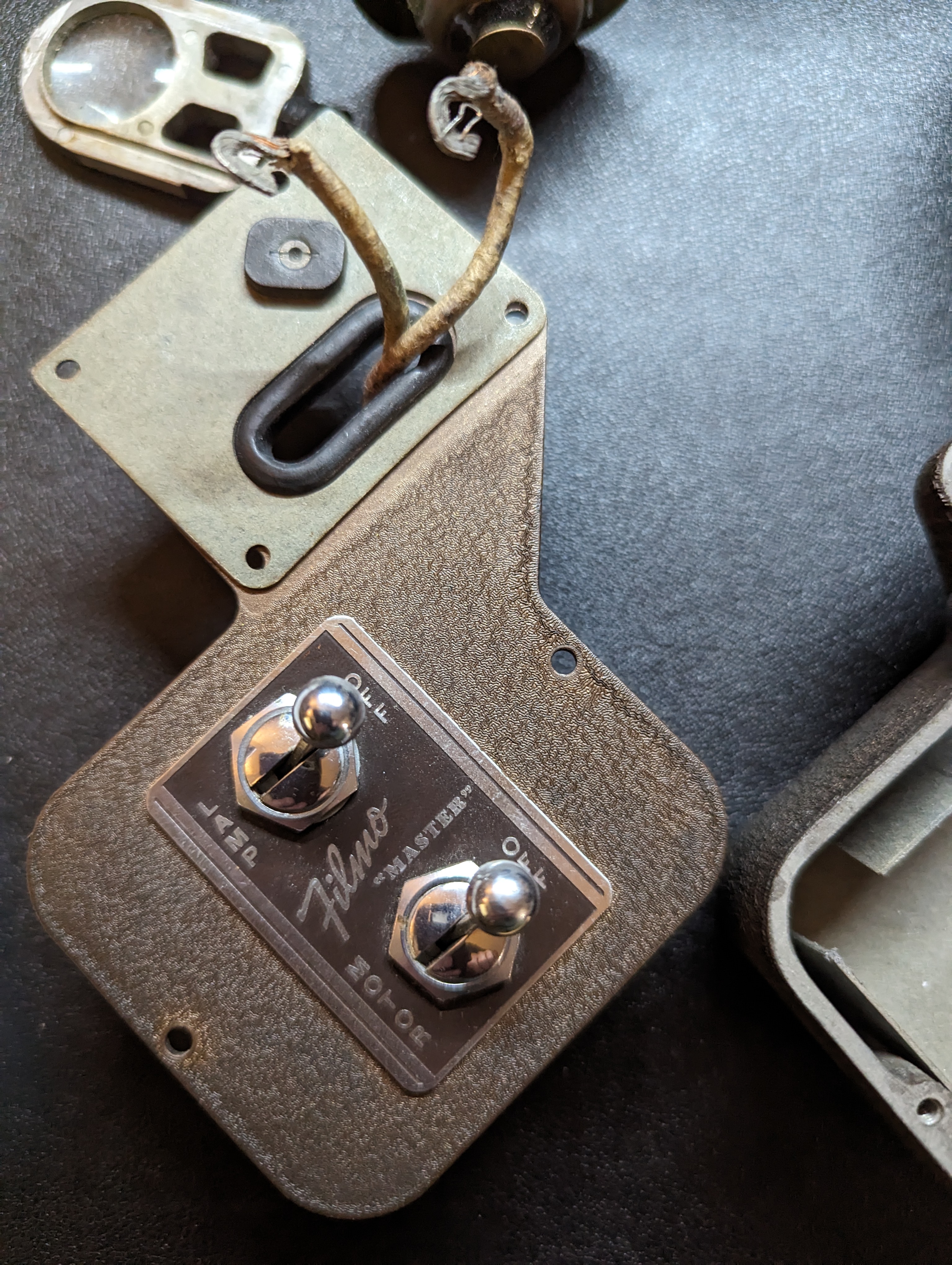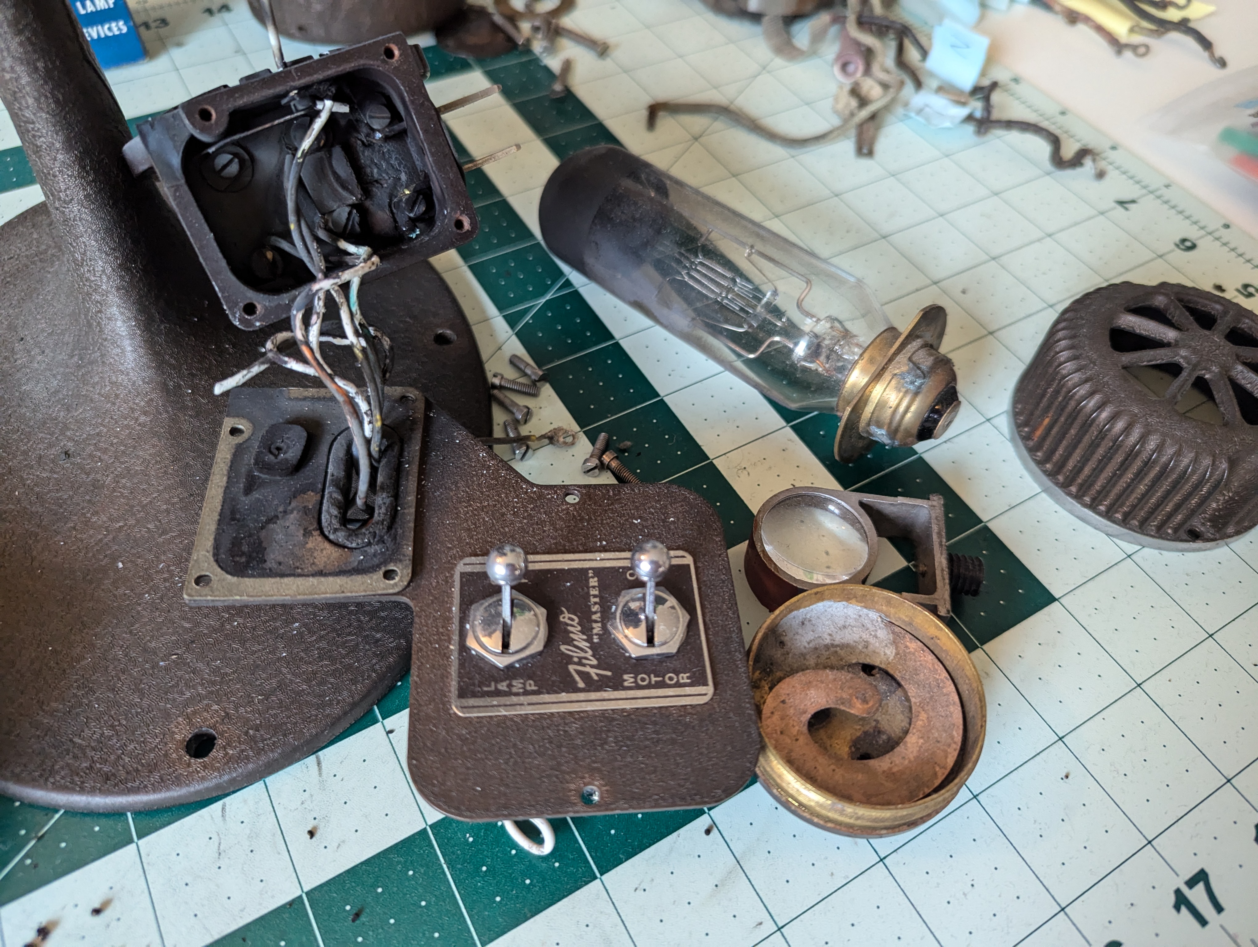 While I don't know much about putting together vintage film projectors, I do know enough about tearing s*!t apart to get by. So I unscrewed all the screws, pulled apart the projector body sections, and found myself a nice pile of ratty dirty electrical wires.